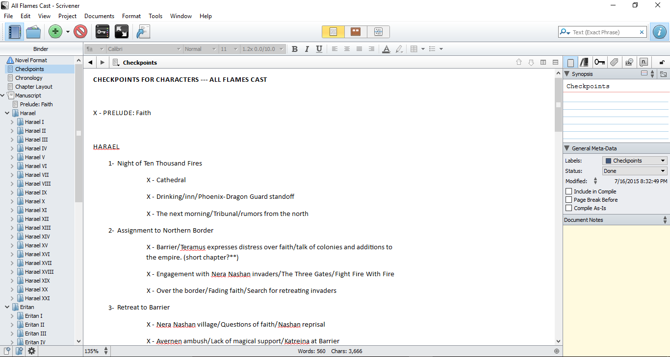 This requires a timeline/chronology page, so I can keep straight when respective chapters take place and how they work together. With Scrivener’s easy format, I can have my checkpoint page, my chapter layout, and my chronology page grouped together, just a click away. As I finish chapters, I can go into my chapter layout and put that awesome-looking bold X next to them. It’s a nice way to visually track and motivate myself as I progress through.
